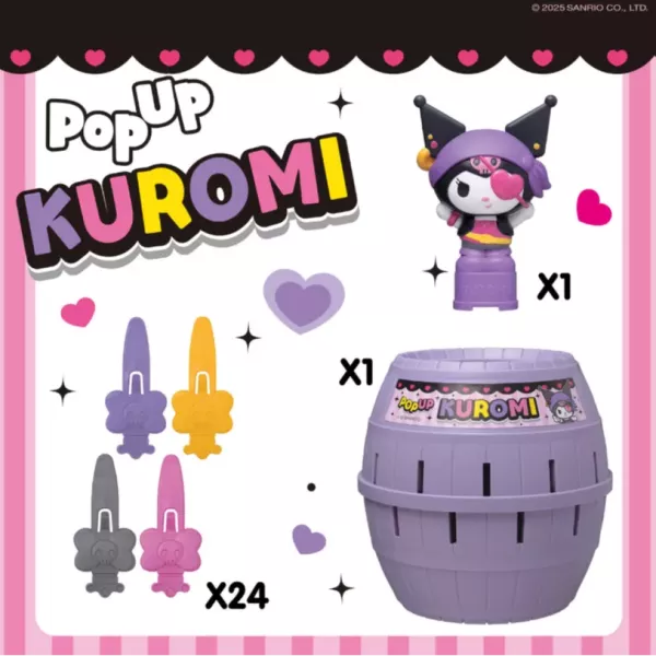 Fedezd fel a szórakozás világát a Pop Up: Kuromi társasjátékkal, amely egy izgalmas csavart visz a klasszikus Pop Up Pirate játékba. A játékosok sorban csúsztatják a kis csontváz kulcsokat a hordóba. Ha semmi sem történik, biztonságban vannak. Azonban a rossz hely kiválasztása esetén Kuromi kiugrik a hordóból, és az a játékos kiesik. Senki sem tudja, melyik nyílás lesz a következő, amelyből Kuromi kiugrik, hiszen minden újraindításnál változik!